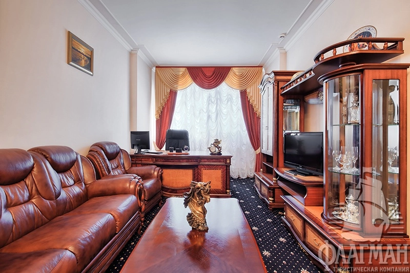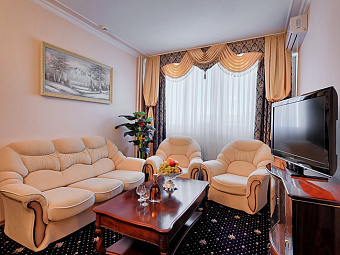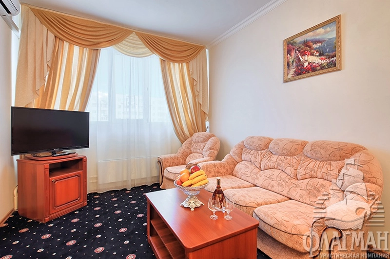 - 2-местный 2-комнатный люкс (макс. 2+1 чел., 39,3 кв. м, телевизор, спутниковое телевидение, кондиционер, ванна, туалет, джакузи, фен, халаты, тапочки, холодильник, телефон, мягкая мебель, утюг, гладильная доска, 2-спальная кровать, еврораскладушка).
