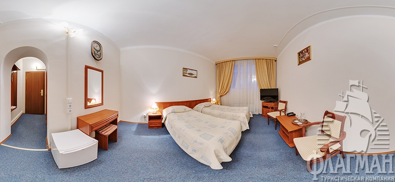 - 2-местный 1 категории (макс. 2+1 чел., 18,8 кв. м, телевизор, спутниковое телевидение, ванна, туалет, фен, тапочки, холодильник, телефон, две односпальные или одна двуспальная кровать, еврораскладушка).