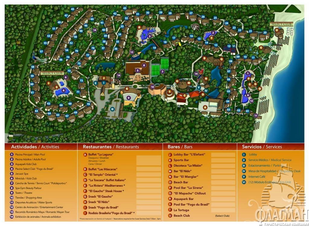- рестораны a la carte: 5 (итальянский La Toscana; мексиканский Las Mаscaras; азиатский El Templo, предварительное бронирование; La Riviera – средиземноморский, вегетарианский гурме; бразильский Podizio; дресс-код)