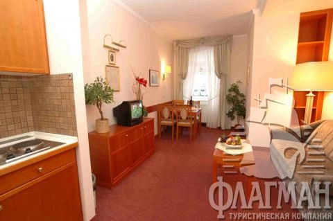 - оборудованная кухня (небольшая, в апартаментах и номерах категории Suite)