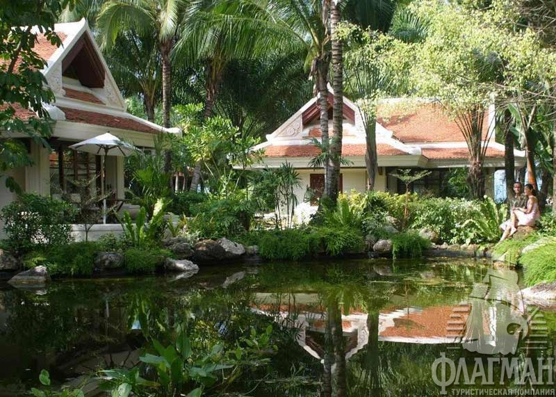 Здание и виллы в тайском стиле, в тропическом саду с прудом и каналами.