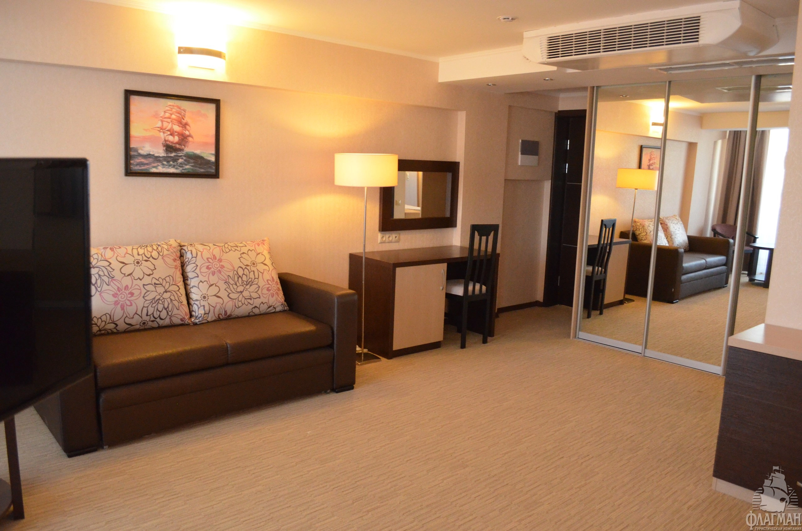 - Suite - удобный двухкомнатный номер для одноместного или двухместного размещения в пастельных (светлых) тонах, площадью 36 м2. Пространство номера разделено на две зоны.Можно выделить спальную зону и гостиную площадь. Номер укомплектован кроватью, двумя прикроватными тумбами, шкафом для одежды, рабочей зоной состоящей из письменного стола и стула. Каждый номер оснащен настенной плазменной панелью, с широким выбором спутниковых тв каналов, автономной системой кондиционирования, электронным сейфом,светонепроницаемыми шторами системы “blackout”. Производится ежедневная уборка комнат. Все номера Sea Galaxy Congress Hotel & Spa оснащены междугородней и международной телефонной связью. Каждый номер оснащен санузлом с душевой кабиной c противоскользящим покрытием. Просторный балкон с потрясающим видом на морской пейзаж оснащен комплектом мебели для террасы, в комплектацию входит столик и два стула.