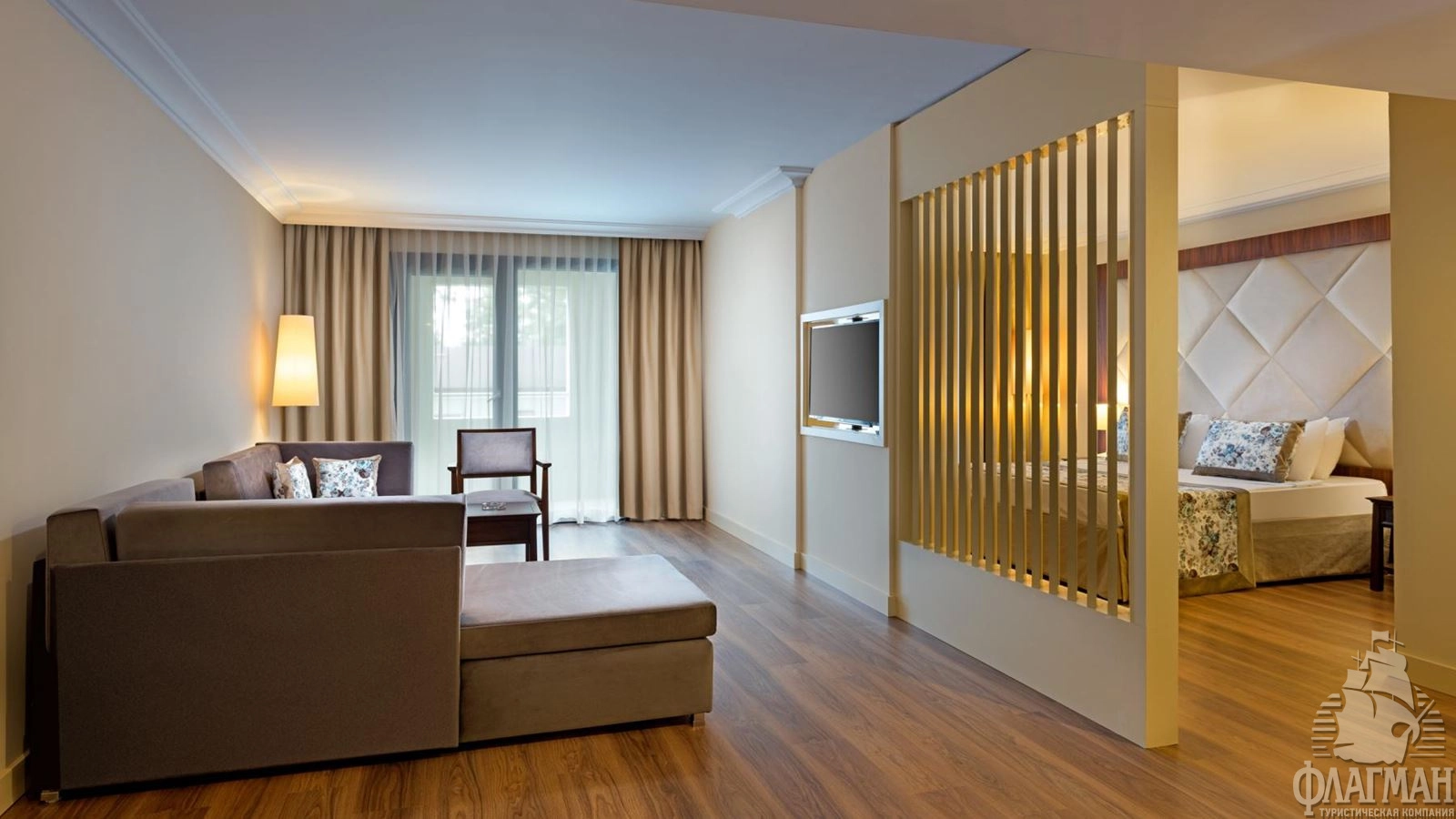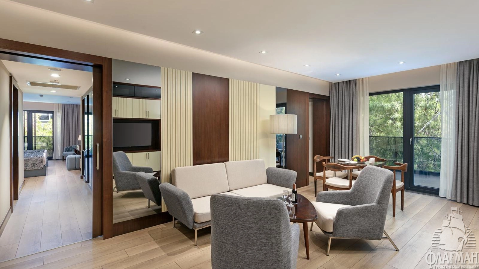 - 2 junior suites superior sea view (50 м2, спальня с гостиной зоной, халаты, ковровое покрытие, подготовка номера ко сну, вид на море, макс. 2+2 чел.) – main building