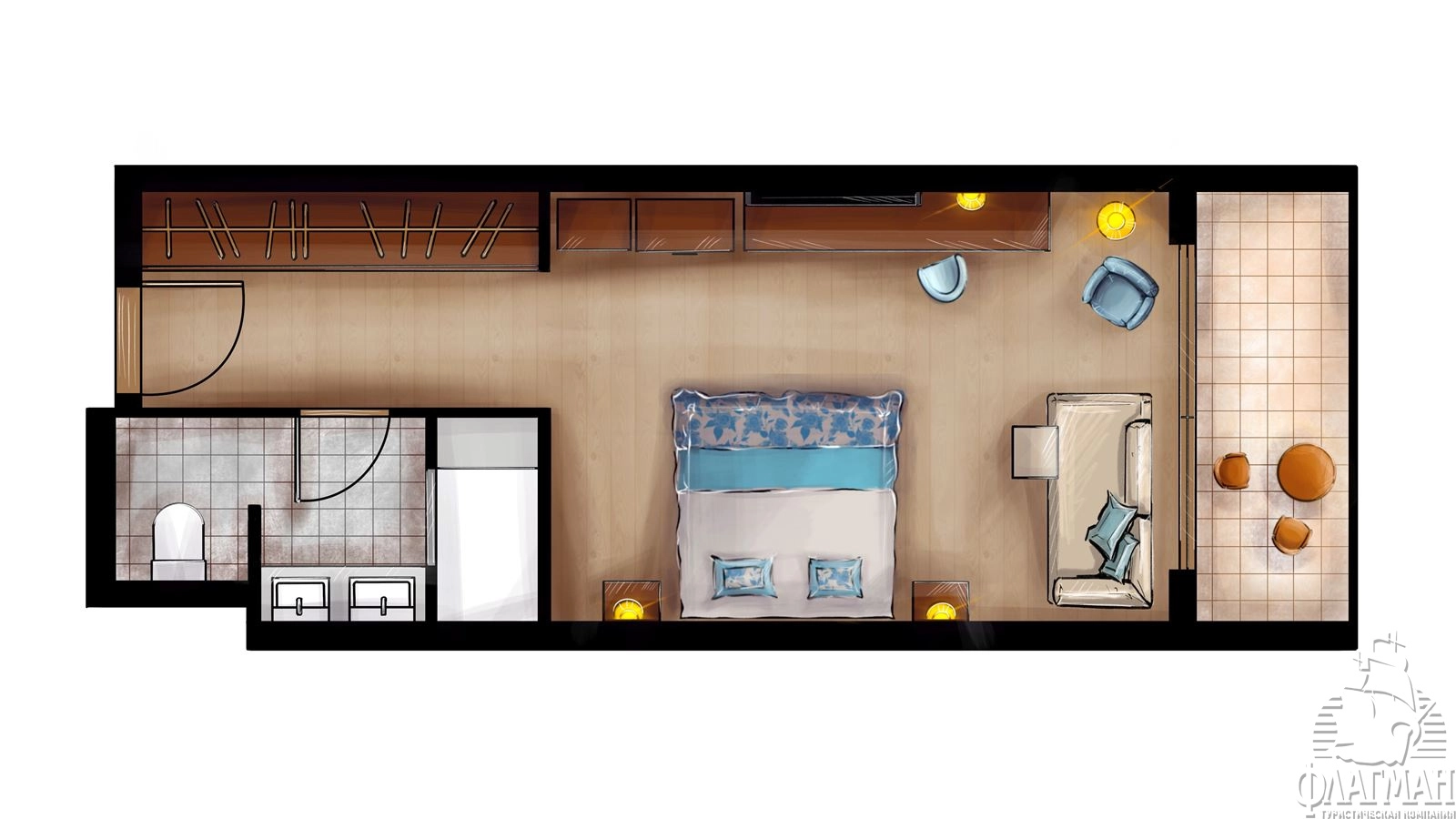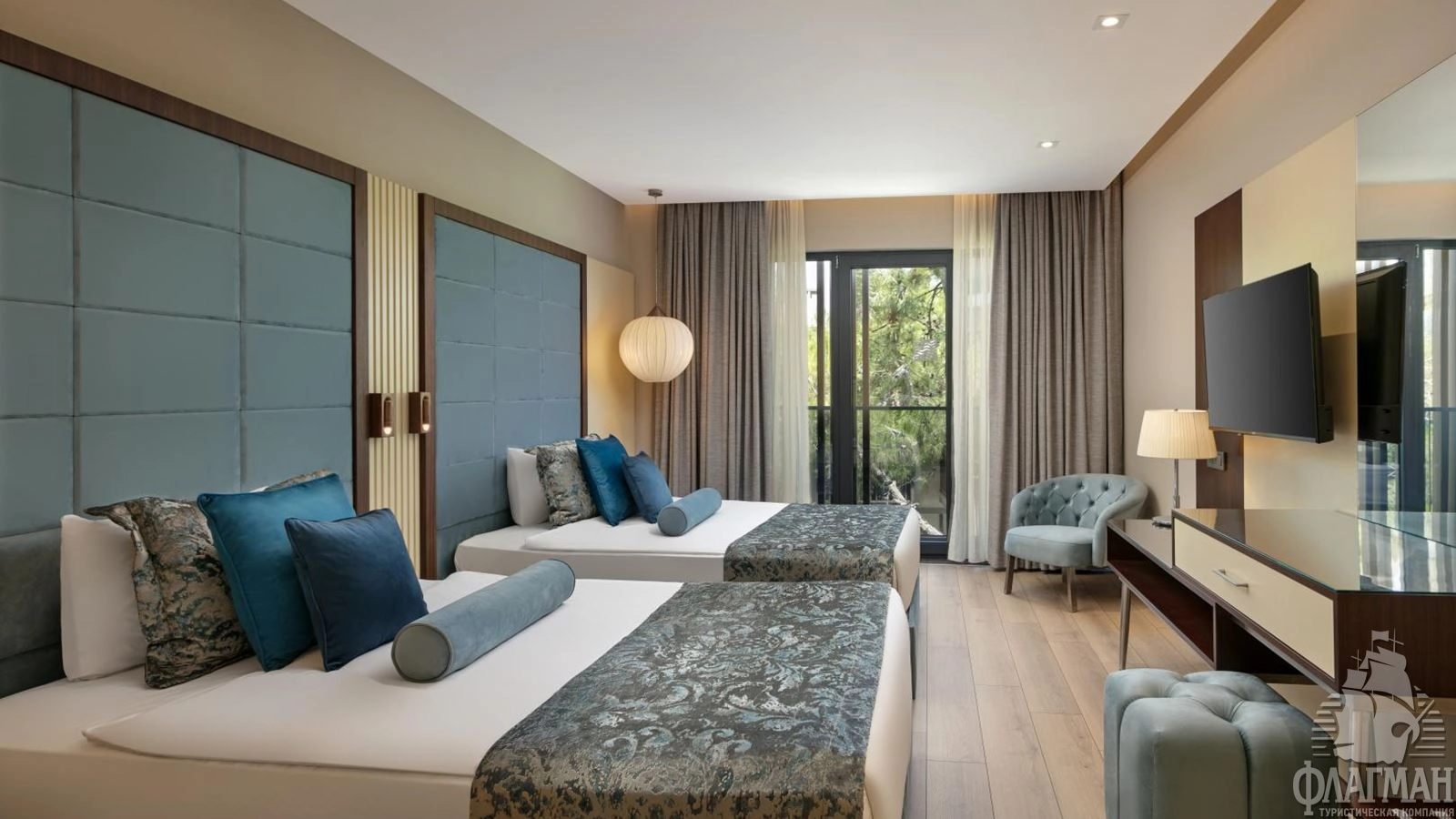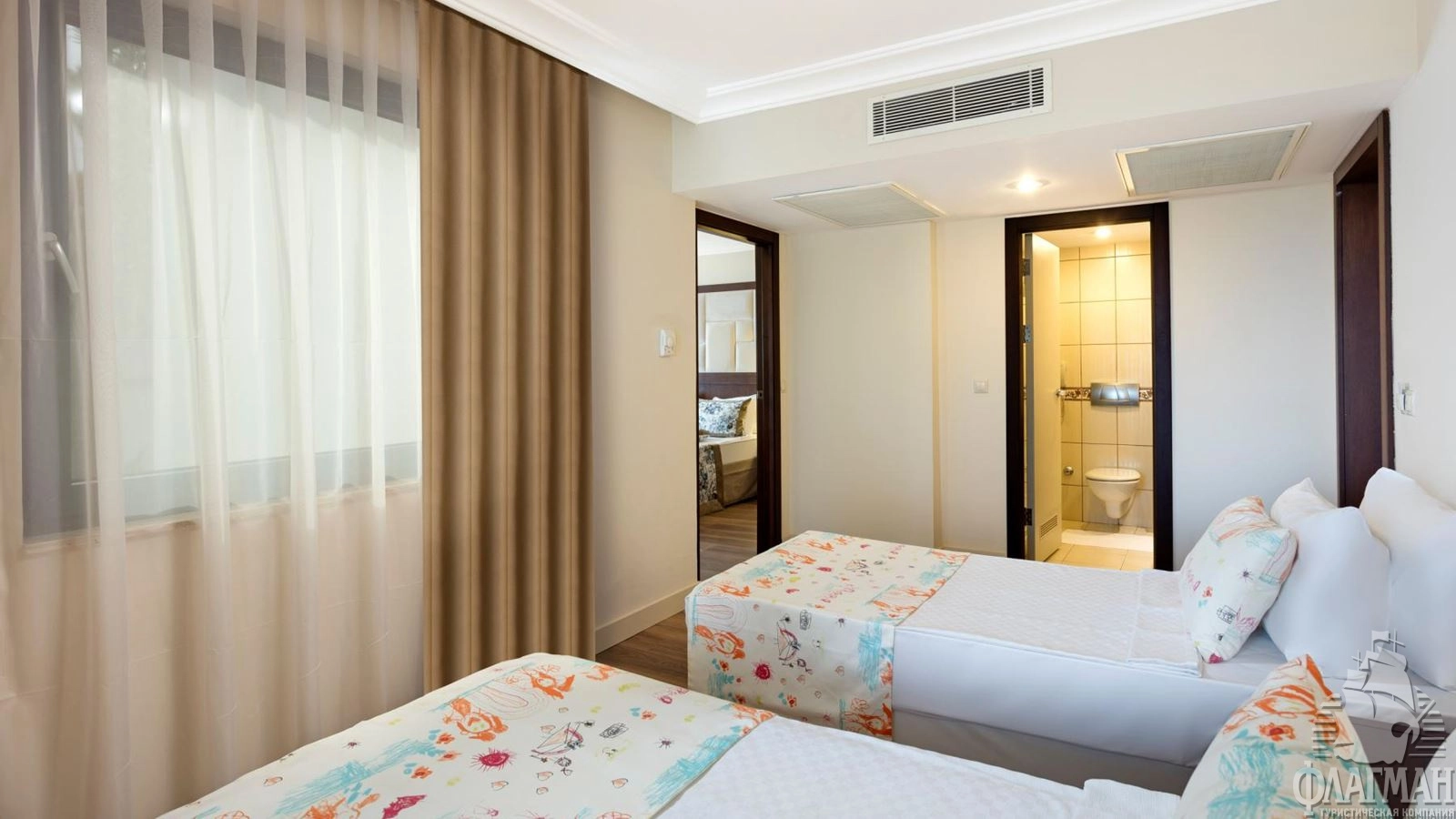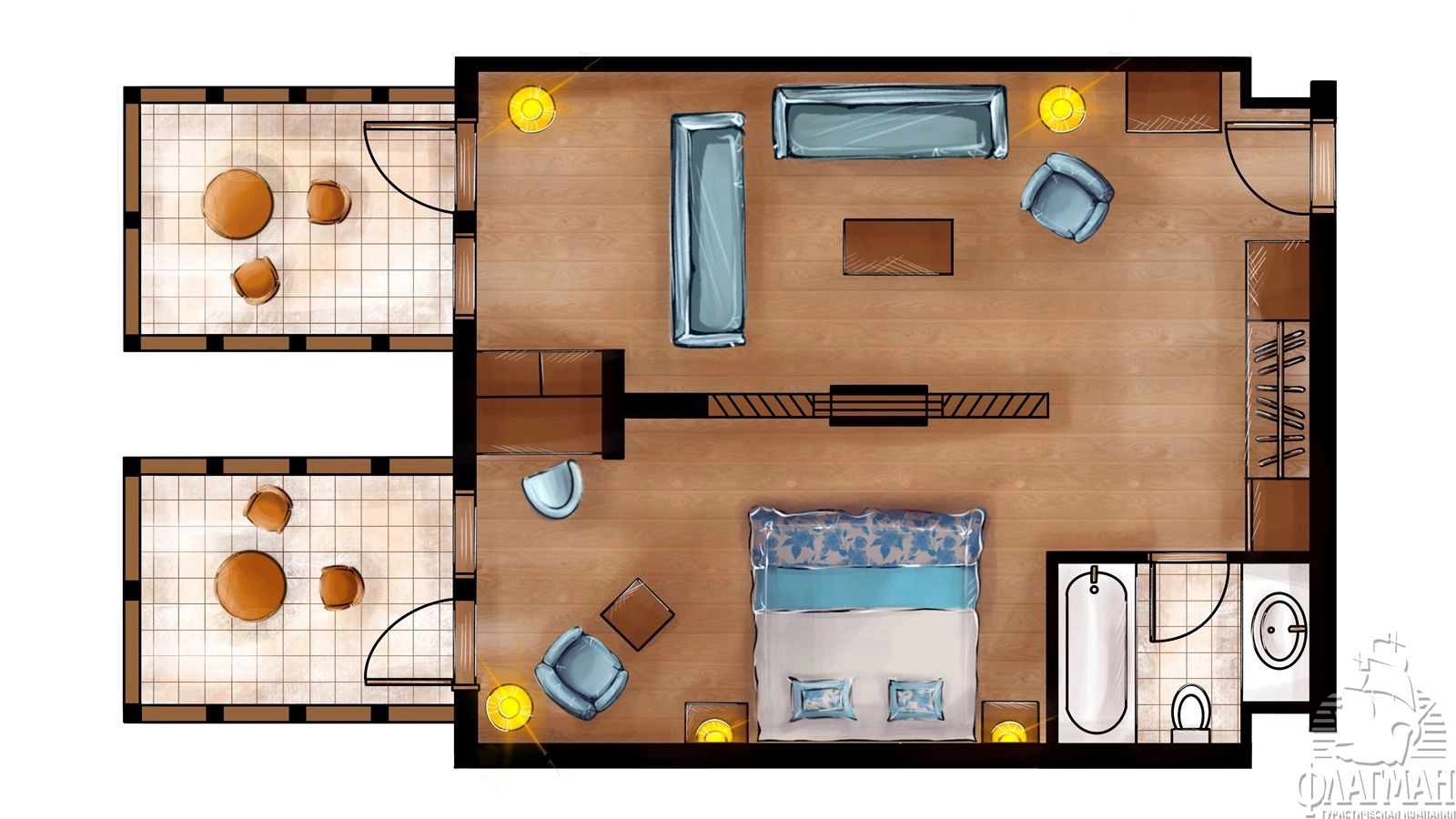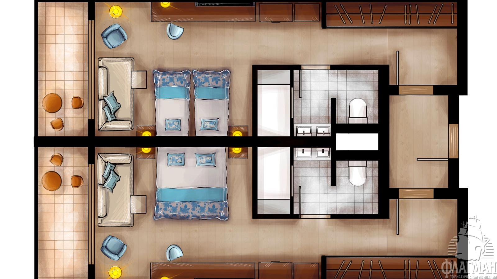 - 12 bungalow family rooms (50 м2, 2 спальни: одна с French кроватью, вторая с 2 twin кроватями, межкомнатная дверь, 2 ТВ, 1 ванная комната, халаты, макс. 2+2 чел.) – bungalow