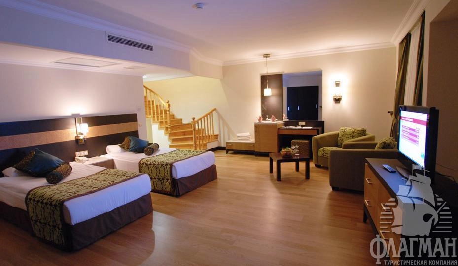 24 двухуровневых Lale Suite (на первом уровне: спальня без двери, ванная c душем; на втором уровне: спальня с дверью, ванная, 2 ТВ, 2 балкона, макс. 4+1 чел., 60 м2);
