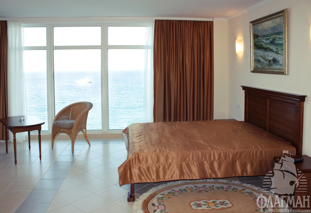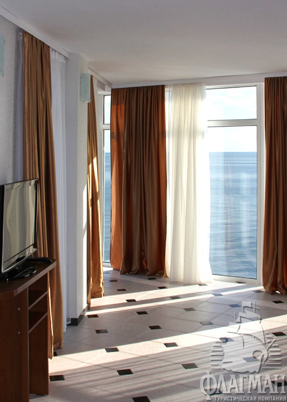 - 2-местный 2-комнатный номер люкс-комфорт. Площадь номера 68 кв.м. 2-комнатный номер с двумя совмещенными саузлами. В номере: двуспальная кровать, прикроватные тумбочки, шкаф, мягкий уголок, журнальный столик, 2 пуфика, плазменный телевизор, мини-бар, набор посуды, сейф, фен, кондиционер. На балконе есть набор пластиковой мебели. В номерах большие панорамные окна с видом на море. Одно дополнительное место.