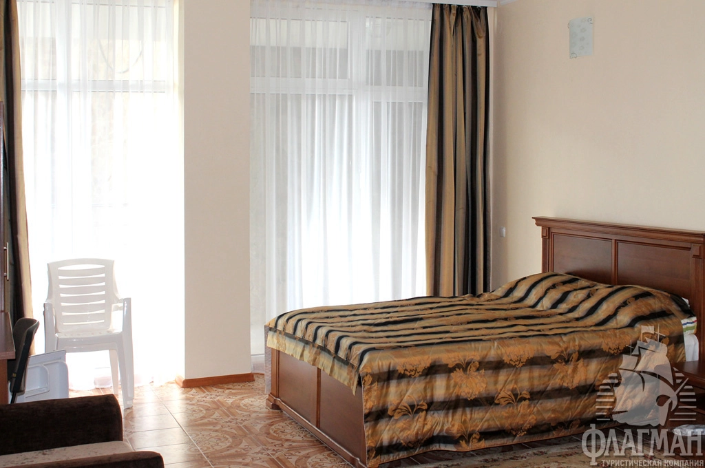 - 2-местный номер стандарт эконом. Площадь номера 20 кв. метров. В номере: санузел с душем, одна двуспальная или две односпальных кровати, телефон, ТВ, сейф, кондиционер, шкаф, фен, мини-бар, холодильник, электрический чайник. Номер с балконом и боковым видом на море. Одно доп. место-диван-кровать.