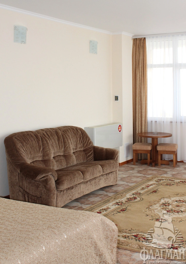 - 2-местный номер полулюкс. Площадь номера 45 кв.м. В номере: санузел с душем, двуспальная кровать, прикроватные тумбочки, шкаф, раскладной диван, журнальный столик, плазменный телевизор, сейф, мини-бар, набор посуды, фен, кондиционер. На балконе есть набор пластиковой мебели. Все номера с большими панорамными окнами с видом на море. Одно дополнительное место.