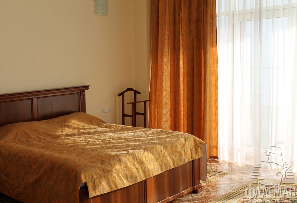 - 3-местный 3-комнатный номер делюкс. Общая площадь номера 105 кв.м., 3-х комнатный номер с двумя санузлами, спальней, гостиной, залом. В номере двуспальная кровать, шкаф, прикроватные тумбочки, мягкий уголок, 2 журнальных столика, раскладной диван, 2 пуфика. Балкон, боковой вид на море. Общая система кондиционирования, Wi-Fi, плазменный телевизор, чайник, набор посуды, мини-бар, сейф, фен. Одно дополнительное место.
