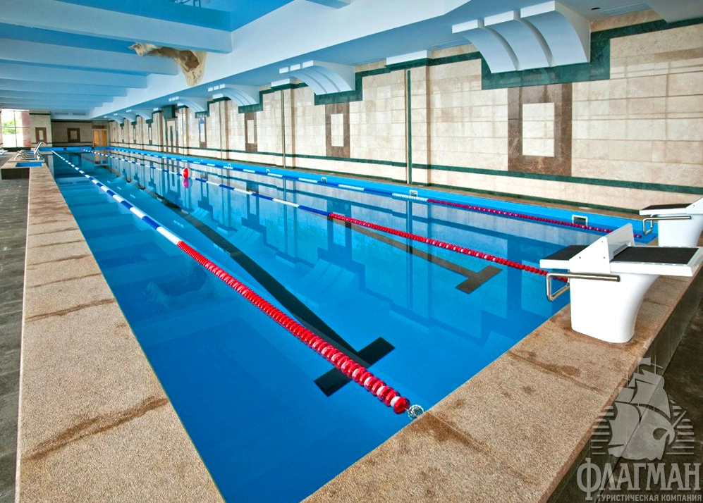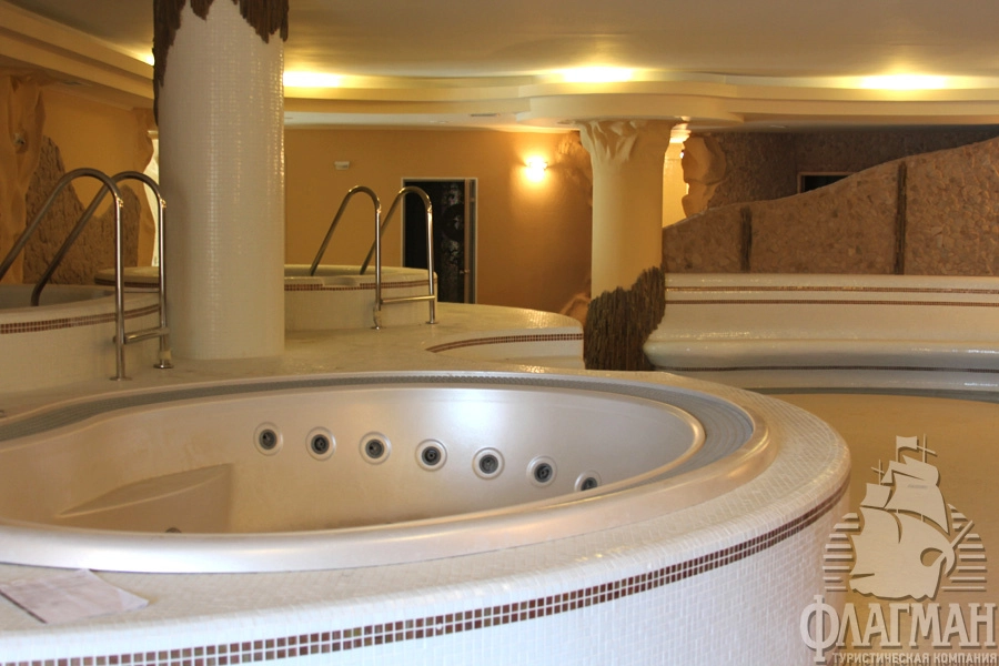 - SPA – комплекс: на первом этаже расположены массажные кабинеты (2 кабинета ручного массажа, кабинет тайского массажа, косметологический кабинет); раздевалки с душевыми, парикмахерская. На минус первом этаже: 6 бань (хаммам, римская, финская, русская, сенная, грязевая), 2 разнотемпературные купели (теплая и ледяная), SPA - бассейн с гидромассажем, кабинет талассотерапии, солярий. На минус втором этаже находится 50-ти метровый подогреваемый бассейн с морской водой на 3 дорожки с отделениями для гидромассажа и фонтаном