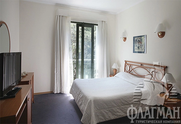 - 2-местный полулюкс (макс. 2+1 чел., 44 кв. м, Wi-Fi, ЖК / LCD телевизор, кондиционер, ванна, туалет, фен, балкон, терраса, электрочайник, мини-бар, телефон, мебель на балконе, 2-спальная кровать, вид на море и парк). Доп. место - диван, может быть установлен без ограничения по возрасту.
