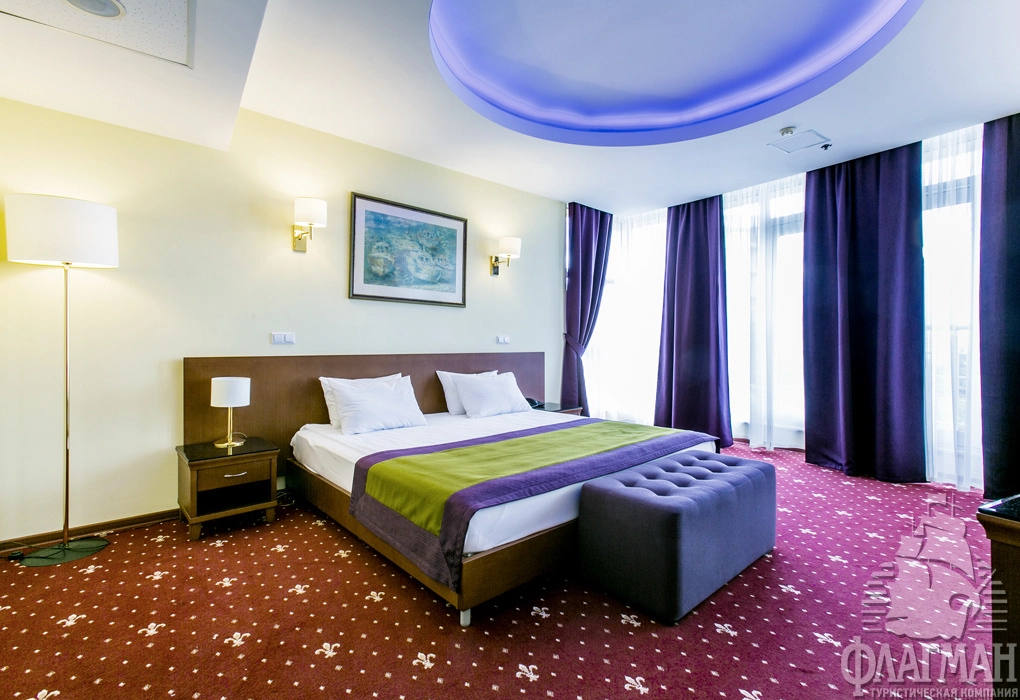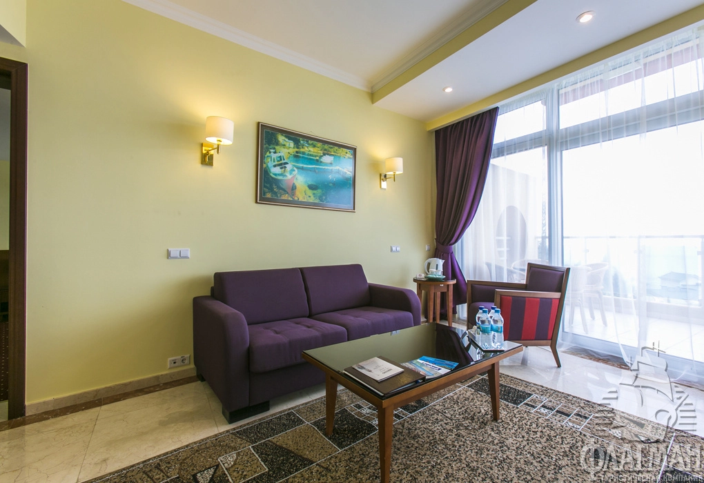 - 2-местный 2-комнатный люкс (макс. 2+1 чел., 45 кв. м, Wi-Fi, ЖК / LCD телевизор, DVD-проигрыватель, кондиционер, ванна, туалет, фен, балкон, электрочайник, мини-бар, сейф, мягкая мебель, 2-спальная кровать, вид на море и парк. В номере две комнаты - гостиная и спальная). Доп. место - диван, может быть установлен без ограничения по возрасту.
