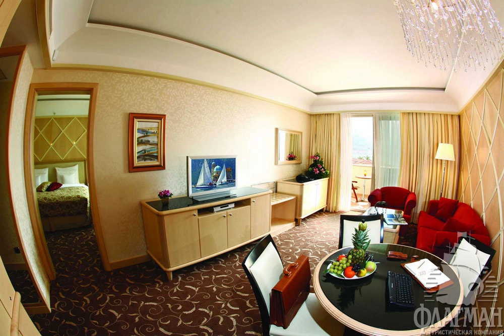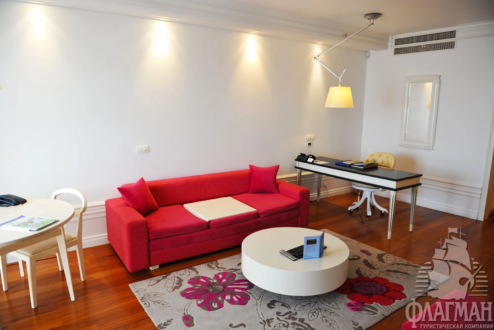- Junior suite (54м2): двухкомнатный номер, рассчитанный на 2 основных спальных места (french bed/twin), третье спальное место - раскладной диван в гостиной; дополнительно можно поставить детскую кроватку. Мин. размещение – 2 чел., макс. - 2 взрослых + 2 ребенка (1-ый до 12 лет, 2-ой – до 6 лет).