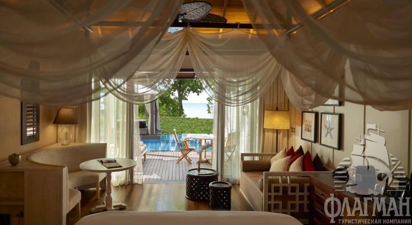 - 14 Beach Pool Villa (150 м², макс. 3 или 2+1 чел.). Одноэтажные бунгало с видом на океан. Спальня с кроватью king-size, ванная комната с ванной, душ под открытым небом, кофемашина для эспрессо, терраса с частным бассейном, шезлонги, беседка. Прямой выход на пляж.