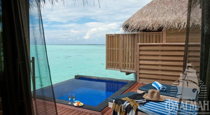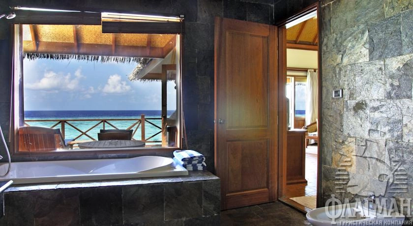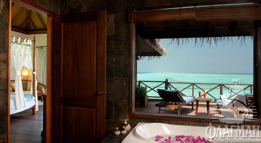 6 Aqua Villa (90 м2, макс. 3 или 2+1 чел.). Надводные виллы с панорамным видом на океан и прямым спуском в воду. Просторная терраса с шезлонгами, «бескрайним» бассейном, гамаком над водой, в спальне: кровать king-size, диван (может быть использован как дополнительное спальное место), ванная комната с ванной и душем.