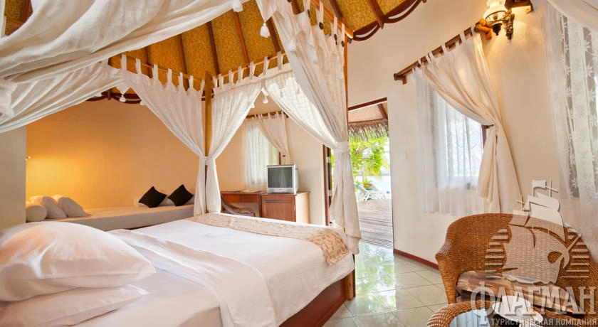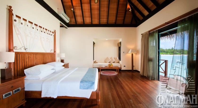 20 Reef Villa (78 м², макс. 3 или 2+1 чел.). Просторные надводные виллы с прямым спуском в воду. Спальня с зоной гостиной, кровать king-size с балдахином, мебель из тикового дерева, широкая терраса с джакузи и шезлонгами.