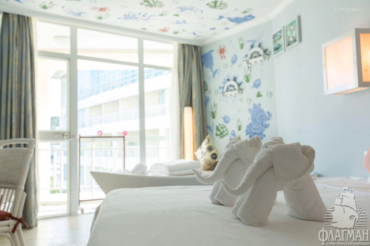 - Deluxe family sea view room (на 4-6 этажах, 30 кв. м, спальня, кровать King-size или 2 односпальные кровати, ванная комната, балкон, боковой вид на море);