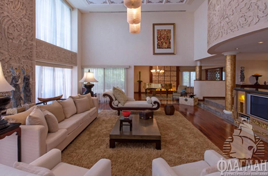 - 1 Grand Lagoon Suite (вид на сад, 390 м2, двухуровневый: гостиная, обеденная зона, кухня, музыкальный зал с роялем, кабинет, 2 спальни, терраса с шезлонгами, 2 ванные комнаты)