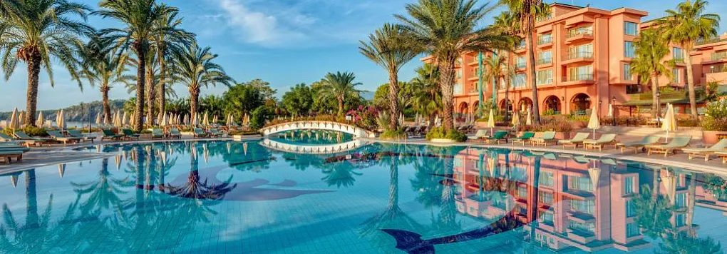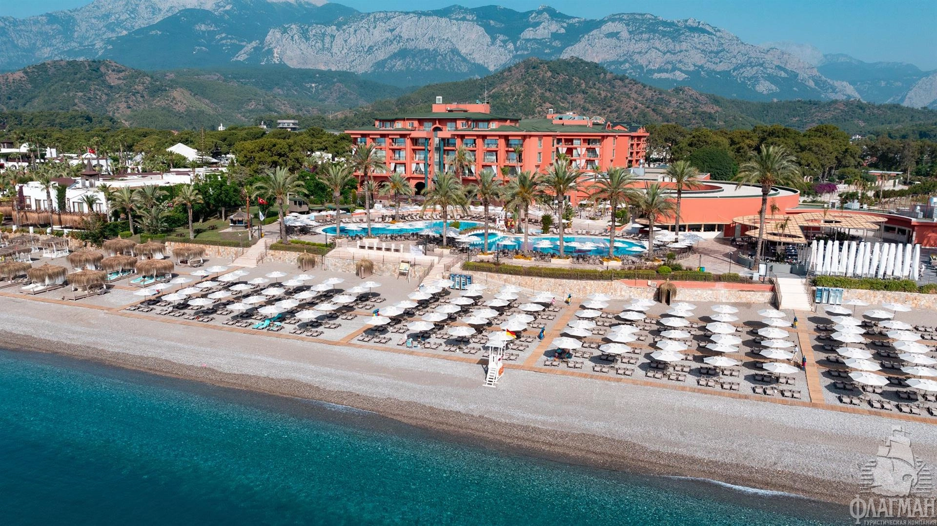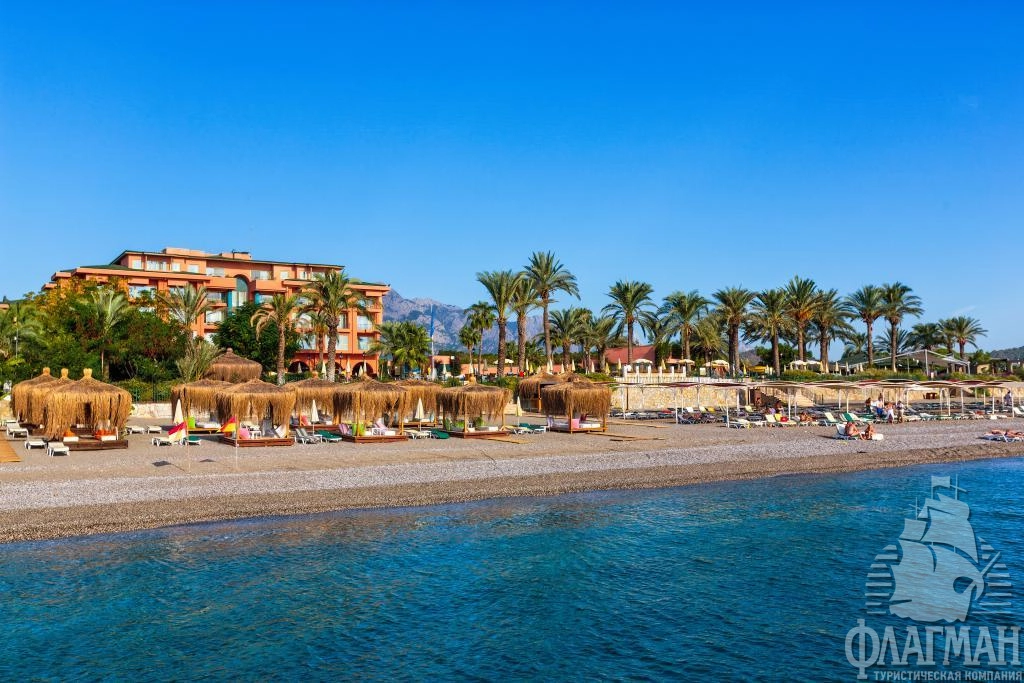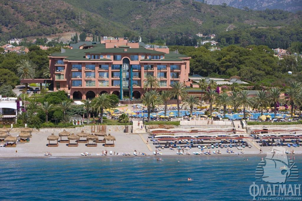 Расположен в 65 км от аэропорта г. Анталья, в 10 км от г. Кемер, в поселке Чамьюва, на самом берегу моря.