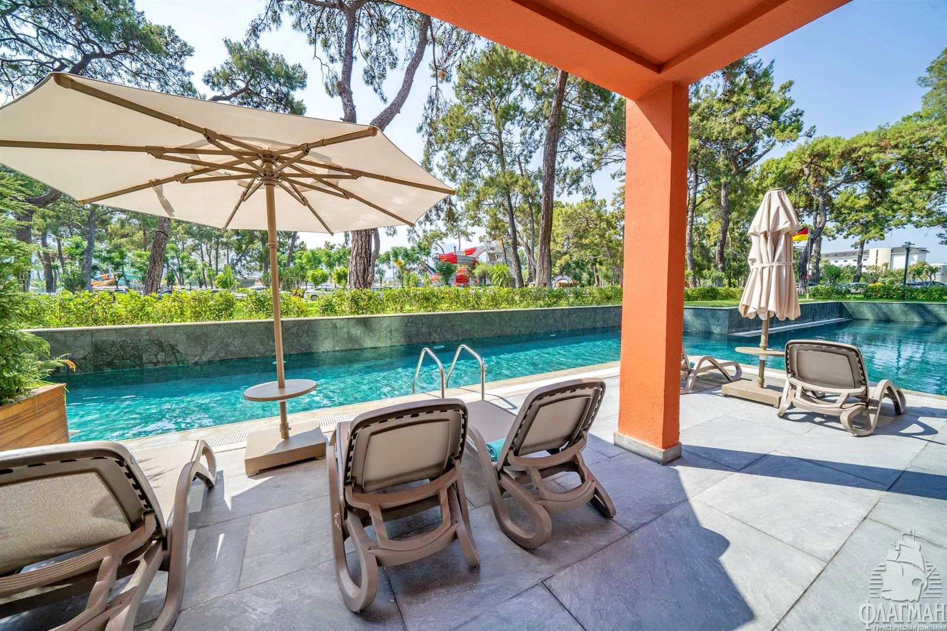 - у бассейна зонтики, шезлонги, матрасы: бесплатно