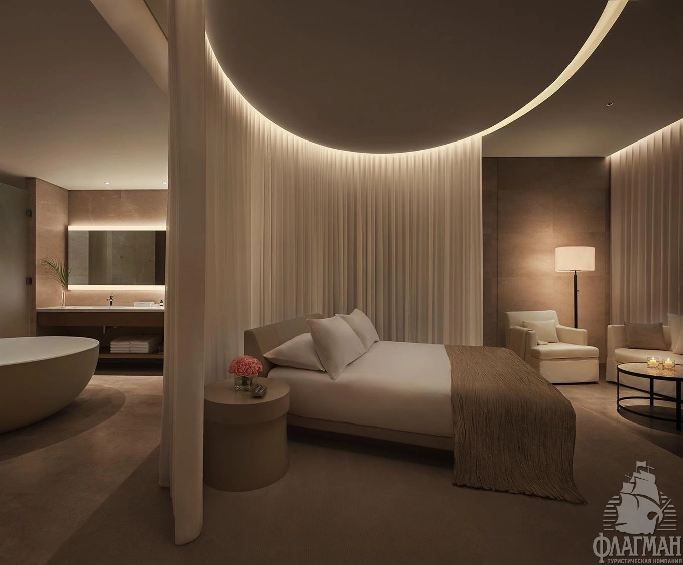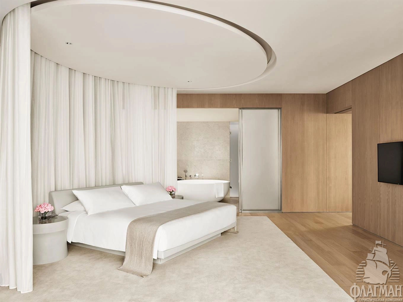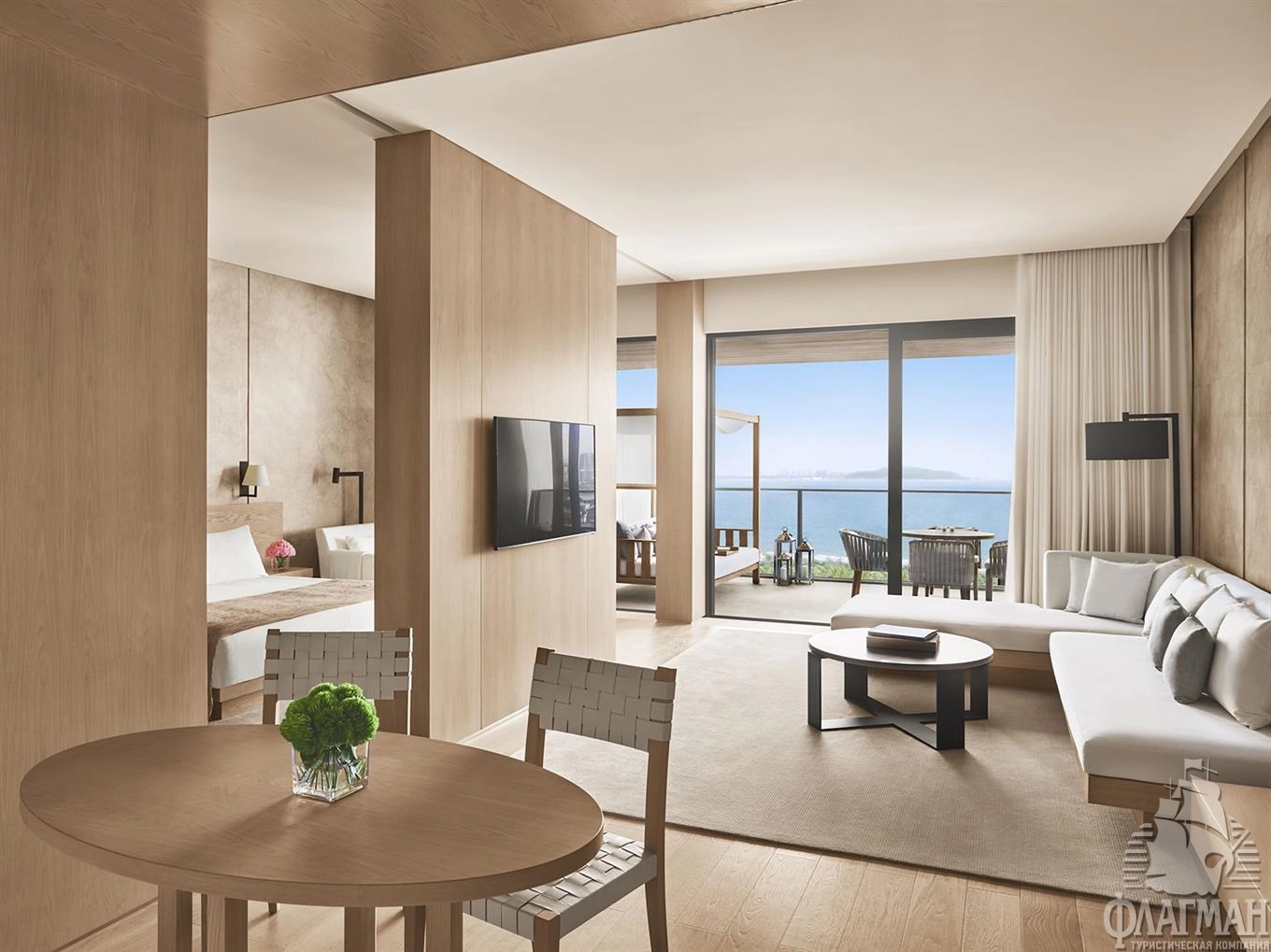 - Grand view suite (основное здание, на 2-6 этажах, 101 кв. м, спальня, кровать King-size, гостиная, межкомнатная дверь, ванная комната, балкон, вид на бассейн и море);