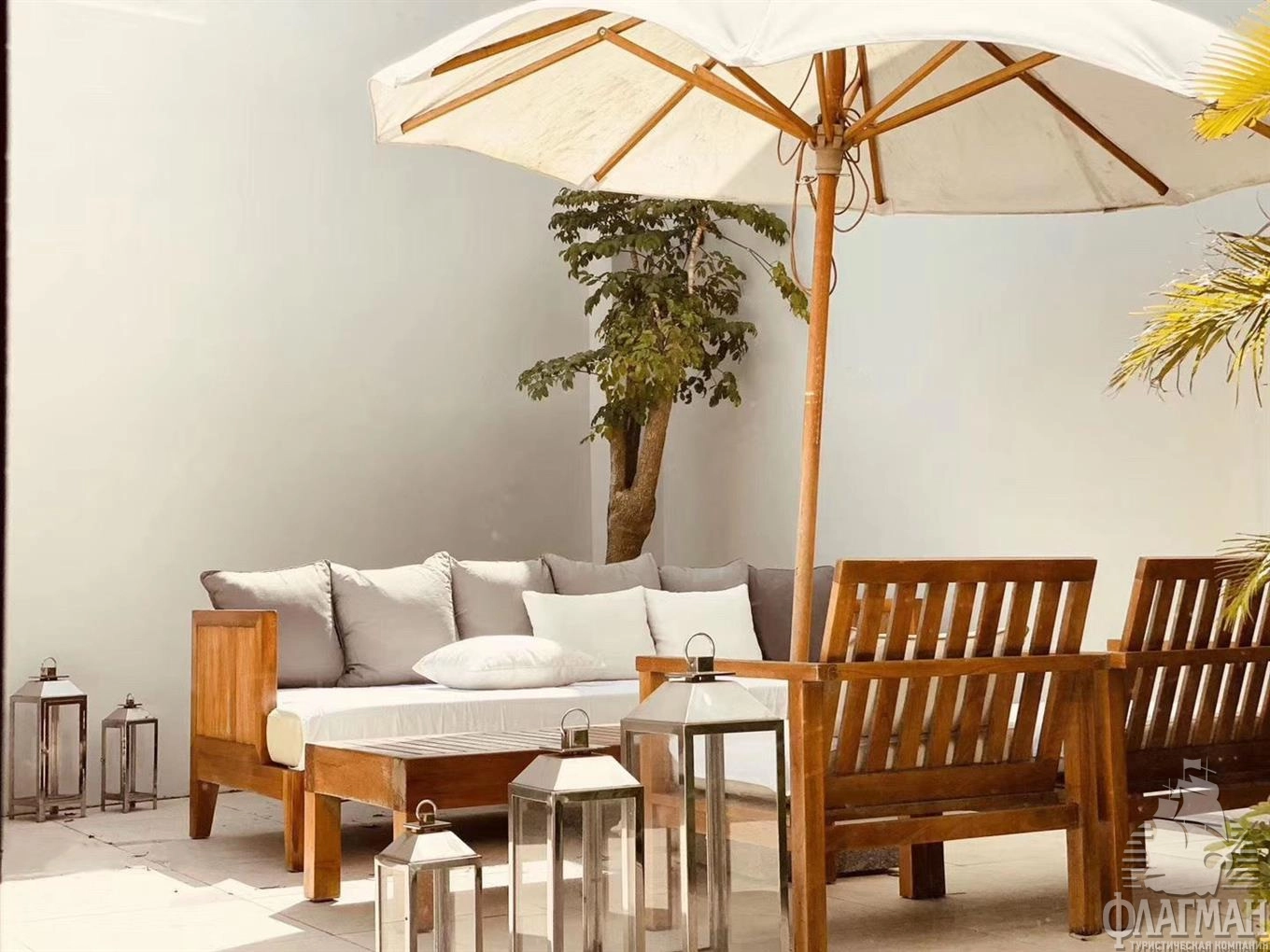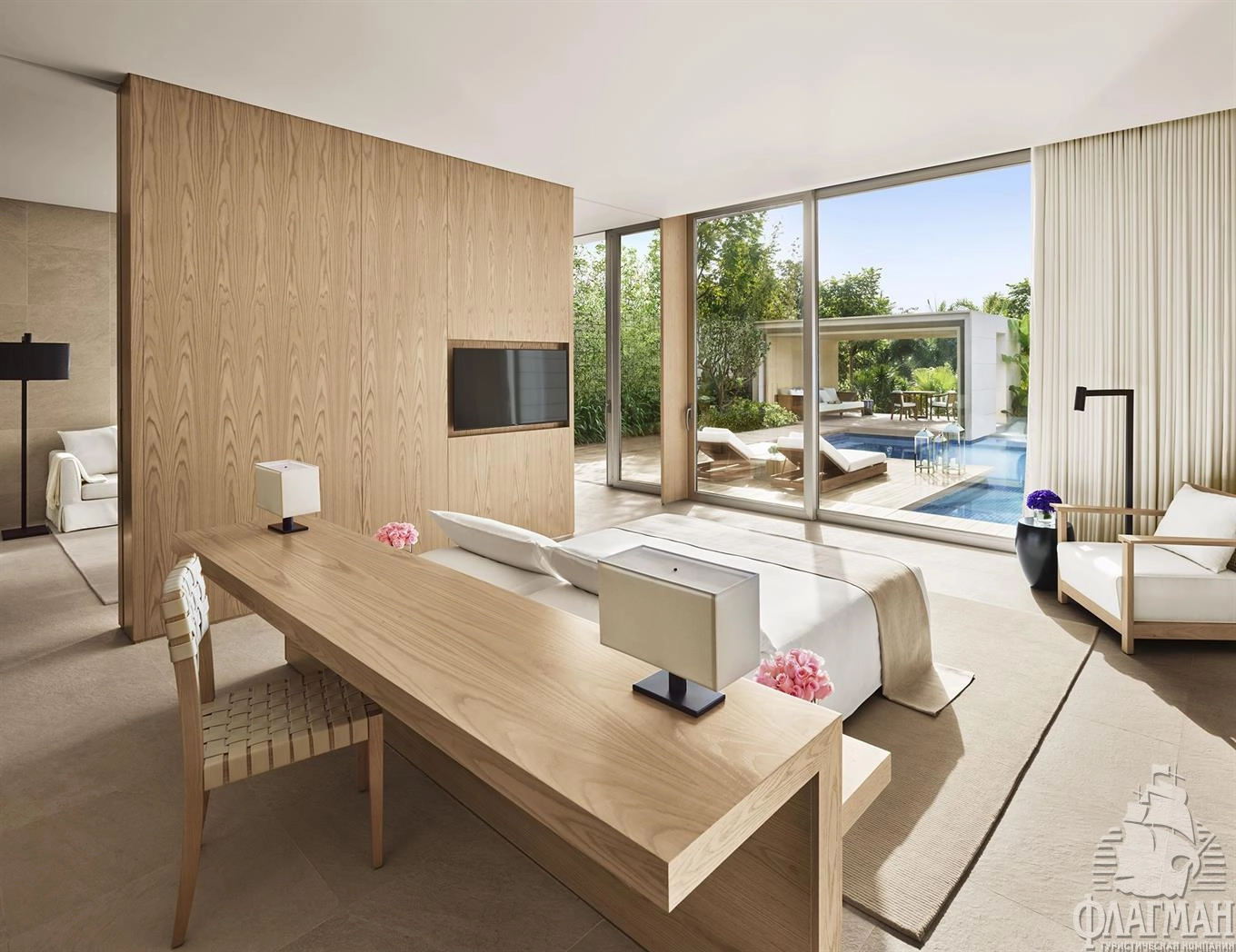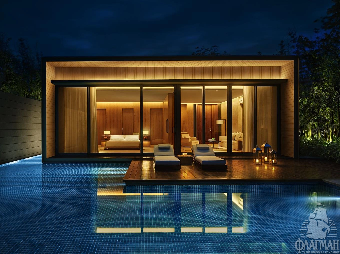 - One bedroom villa 150 кв.м, кровать размера "king-size", отдельная гостиная комната, отдельная обеденная зона, ванная комната, вид на тропический сад, бассейн, терраса с лежаками и открытый павильон.;