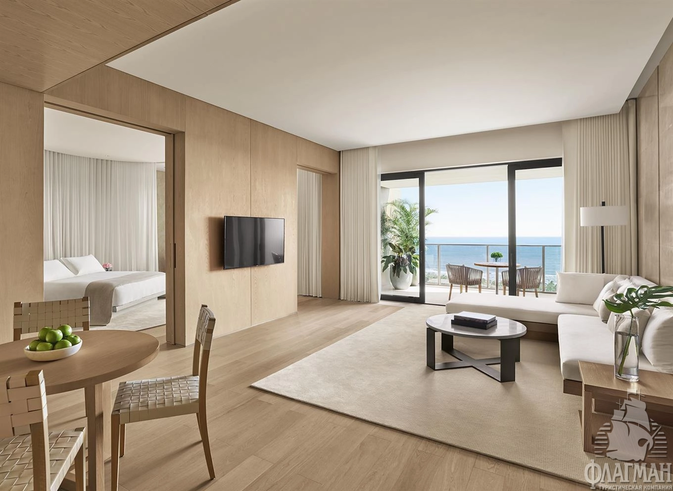 - Ocean front loft suite (на 8-11 этажах, 126 кв. м, спальня, кровать King-size, гостиная, межкомнатная дверь, ванная комната, балкон, вид на бассейн и море);