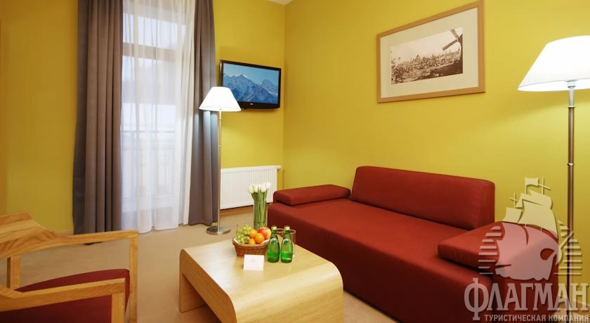 4 номера Сюит (56-83 км.м) - двухкомнатный номер представительского класса, с большой двуспальной кроватью В номере: телевизор, телефон, высокоскоростной проводной интернет и бесплатный Wi-Fi, мини-бар, фен, халат и тапочки.