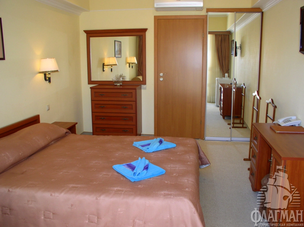 - Стандарт В 2-местный. В номере: двуспальная кровать, комод, прикроватные тумбочки, пуфик, шкаф, кондиционер, сейф, телевизор ЖК, телефон, холодильник.