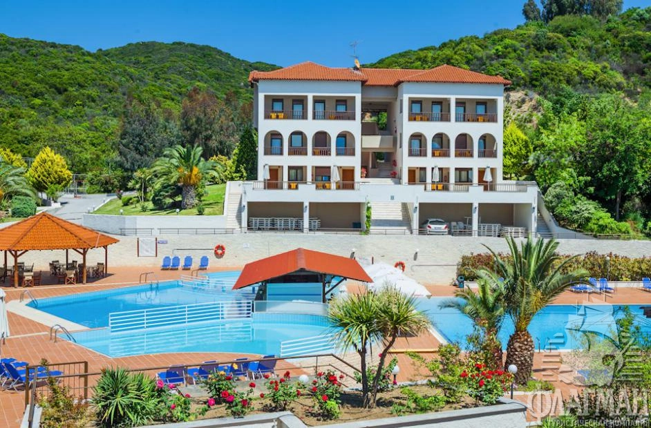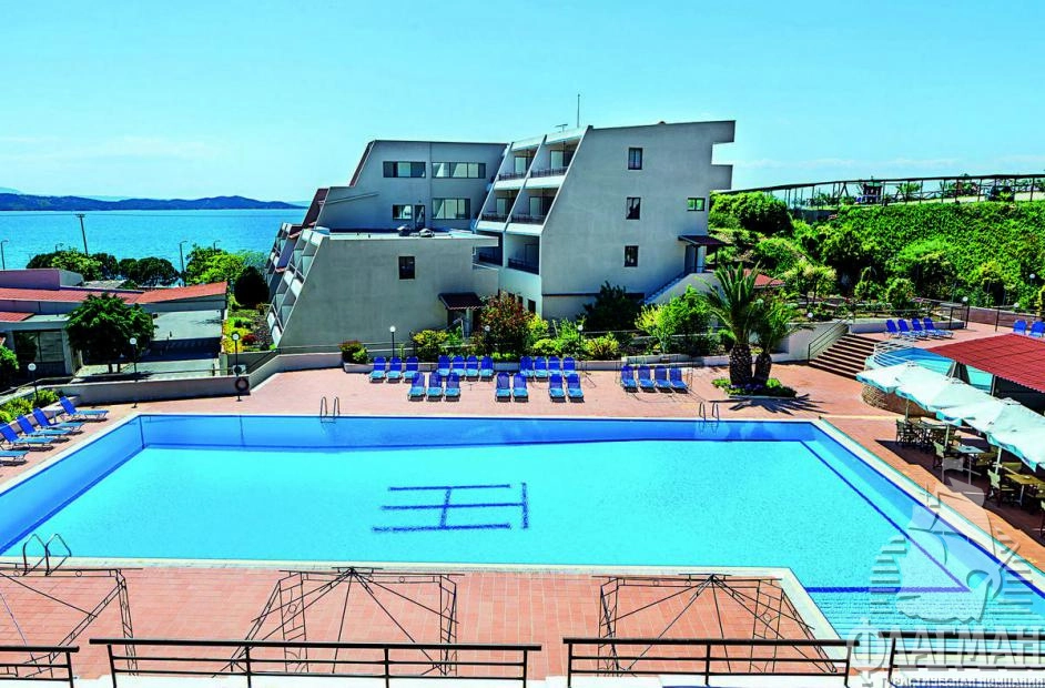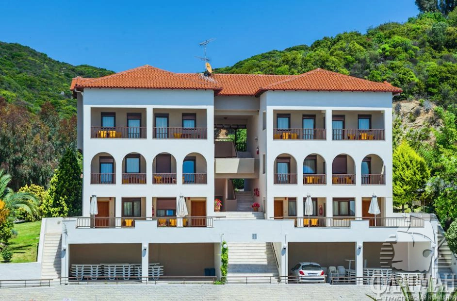 Расположен на полуострове Афон, в 2 км от поселка Урануполи, в 115 км от аэропорта г. Салоники, через дорогу от моря.