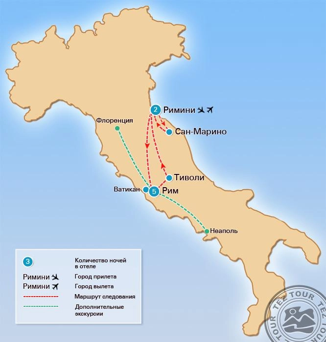 * прогулка по исторической части Сан-Марино организуется либо в 1-ый день по прибытии, либо в последний день до трансфера в аэропорт (в зависимости от расписания рейсов). В случае позднего прибытия самолета в Италию и раннего вылета из Италии прогулка по исторической части Сан-Марино будет отменена без компенсации.